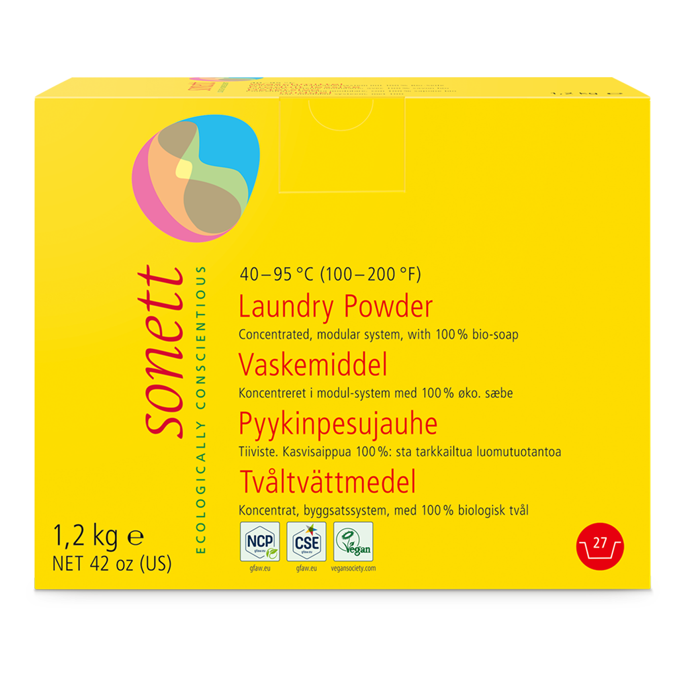 Fyrir allan hvítan og litaðan þvott úr bómull, hör, hampi og gerviefnum. Aðal innhaldsefnin í Sonett þvottaduftinu eru hrein jurtasápa. Öfugt við öll önnur yfirborðsvirk hreinsiefni brotnar sápa niður eftir notkun því hún missir yfirborðsvirku eiginleikana um leið og hún binst kalkinu, sem er alltaf til staðar í frárennsli og sápan brotnar því fullkomlega niður. Með lífrænni sápu úr jurtaolíu, án ensíma og erfðabreyttra efna. Allar olíurnar eru 100% upprunnar frá lífrænni eða líffræðilegri ræktun, 100% niðurbrot.